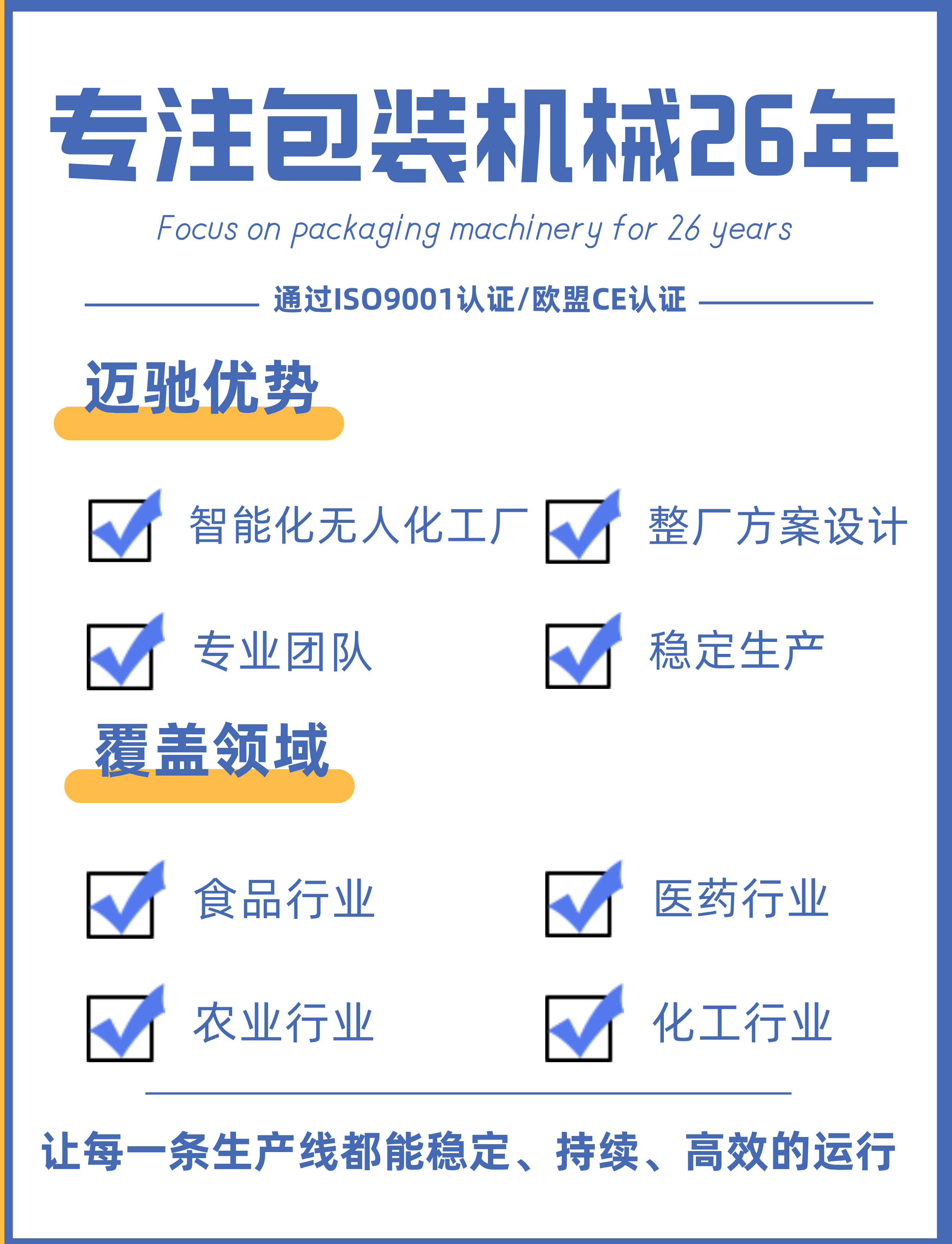 邁馳是一家專業(yè)生產(chǎn)全自動多列粉劑、粉末包裝機整線廠家,可根據(jù)客戶不同物料特性定制一對一方案,可根據(jù)產(chǎn)量定制列數(shù)-有序理料裝盒-自動裝箱-機器人碼垛。整廠方案設(shè)計...